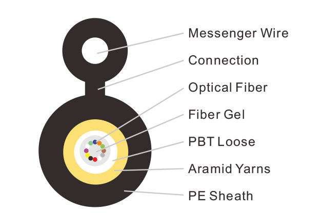 Metallic messenger,central tube,gel filling,non-metallic strength member,polyethylene sheath figure 8 self-supporting outdoor cable for communication purpose.